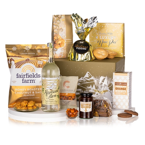 Beautifully presented in a charming gold-printed Christmas carton, this gift is brimming with sweet and savoury delights. Enjoy the rich, festive taste of a Maxwell & Franks Alcohol Free Christmas Pudding, and tuck into Grandma Wild’s Luxury Mince Pies – a seasonal staple that never fails to please.